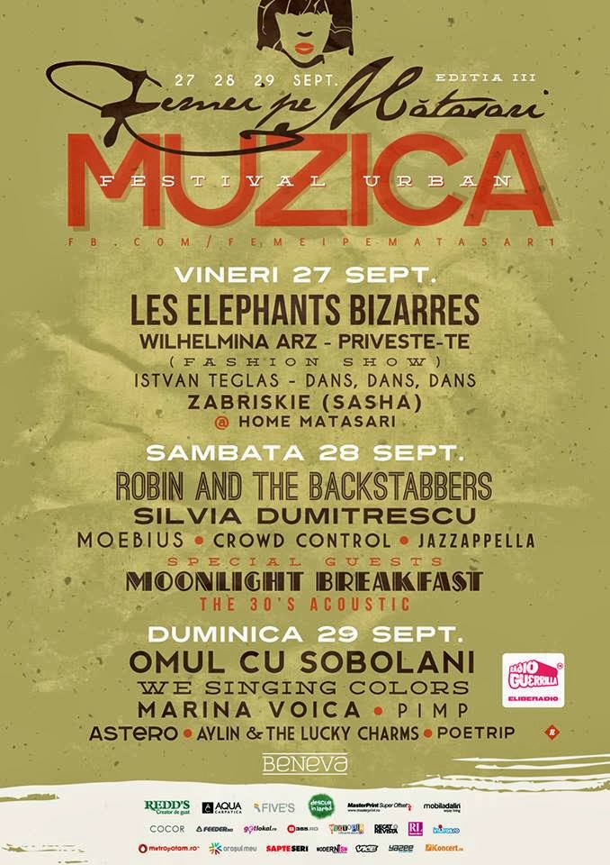 Sambata va avea un program si mai incarcat de concerte, pentru ca ii vom vedea la festivalul „Femei pe Matasari” pe „Robin and The Backstabbers”, pe Silvia Dumitrescu si, in calitate de invitati speciali, pe cei de la „Moonlight Breakfast”, care suna superb in concert. AICI ii puteti asculta live cu piesa „Hello” in clubul Energiea, in seria initiata de Radio Guerilla. E o sa incerc sa nu ratez niciuna din formatii, mai ales ca piesa „Soare cu dinti” a celor de la „Robin and The Backstabbers” mi se pare tare potrivita cu vremea de afara 🙂